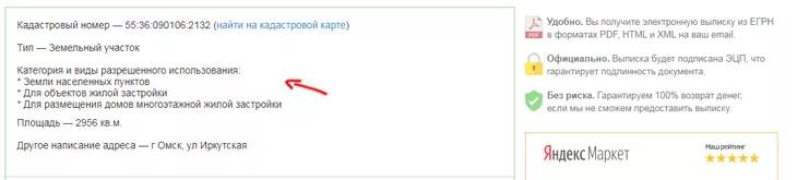 - Для более подробного результата, нажмите на кадастровый номер. Где будет отражена информация о категории земли и видах ее использования.