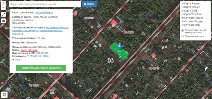 Любой участок на публичной карте можно посмотреть на наличие межевания. Для этого нужно ввести его кадастровый номер или адрес. В результате поиска: