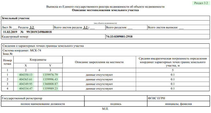 Остается только заказать выписку из ЕГРН, где убедиться, что границы участка учтены верно. В выписке обратите внимание на раздел 3.2, где должны быть указаны координаты.